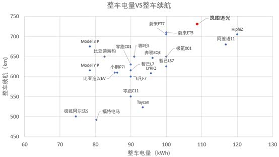 这里我们看到,岚图730公里续航配接近110度电,综合表现处于右上角的位置,属于一个续航表现很好,电量给的也比较扎实的车,仅次于阿维塔和HiphiZ,这俩车对应配置一个40几万,一个60几万。