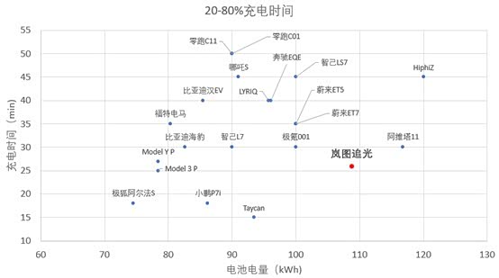 目前岚图追光的充电速度在这些竞品中,处于中等偏上的水平,略差于一些拥有超充功能的车,但是好于市面上所有的非超充车型。 20-80%充电时间约为26min。