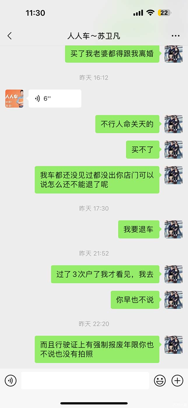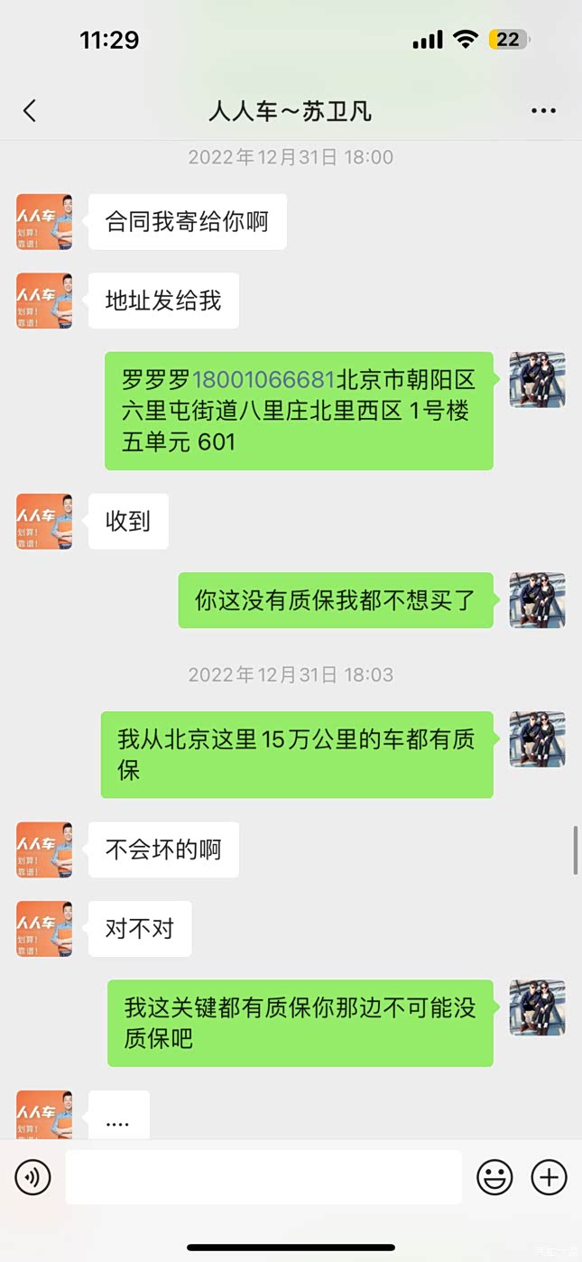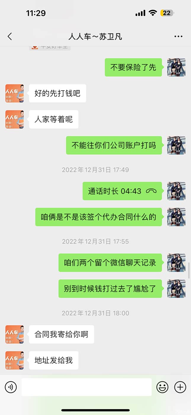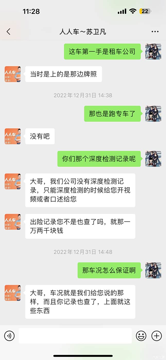 首先建议大家黑猫投诉搜索人人车,那上面说的全部是真实情况。人人车看的起亚车,联系销售说服务费可以打折,约车主看车,检测,检测没有任何车况报告,只是拍视频说车哪里喷漆,发动机和车主框架没动,试车也没问题,但没有深度检测报告,这时销售就催促马上交全部车款,在没有签任何合同,而且要打到销售个人户,车况没有任何说明,说app说的车况你都了解,车就这样,然后app上车已经下架了,无法再查看了。当时打了1万车款,我要求仔细看看再说,销售说只能有半小时仔细看的时间,没发,只能打全款,现在一看车过户3次,app上是1次,app上保障15天可退车,1年2万的保修,也因为服务费砍价没有了。车第一手户是网约车公司,是营转非车辆,销售在买车之前没有尽到车辆售前告知义务。销售不按照人人车的流程操作,我签的合同是和原车主签的,人人车没有签,相当于找销售买的车没有保障。