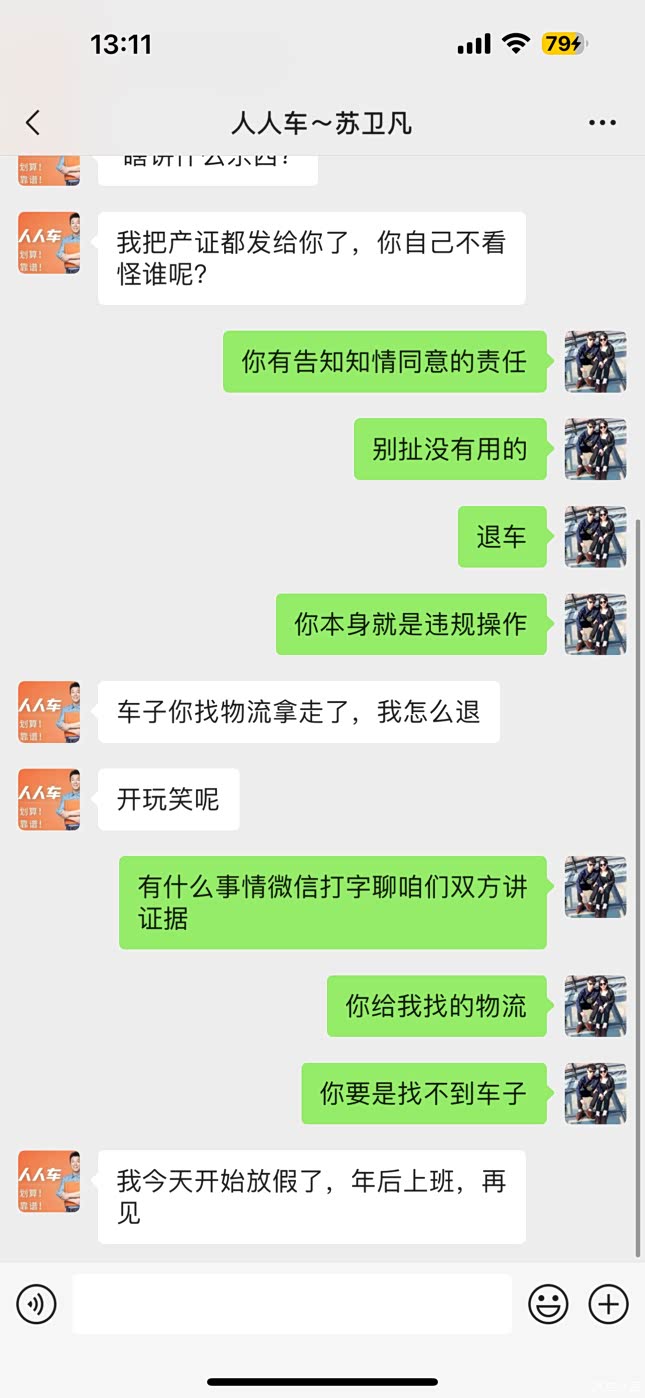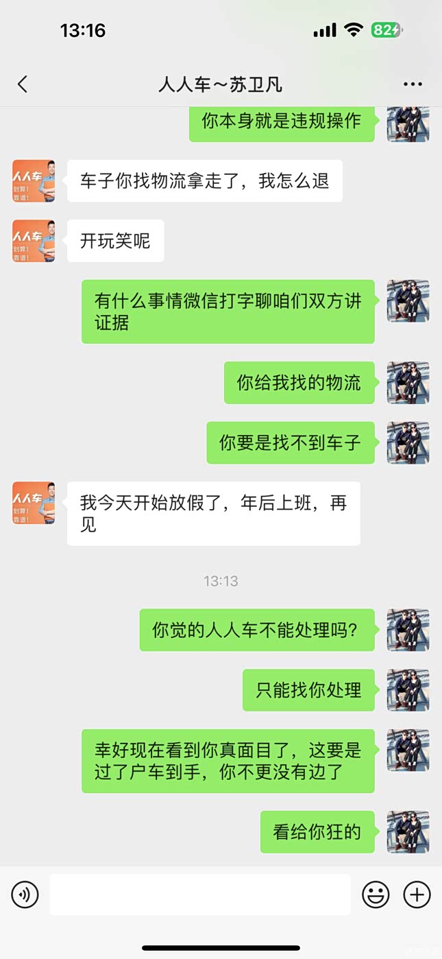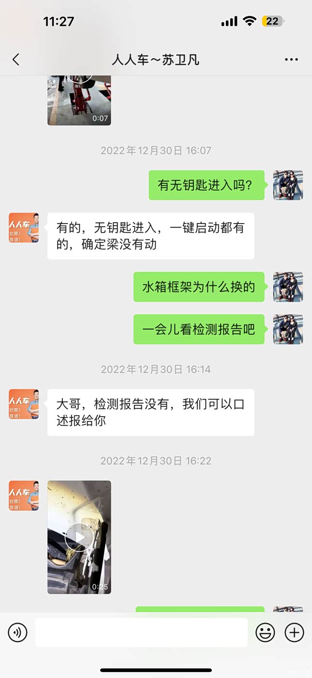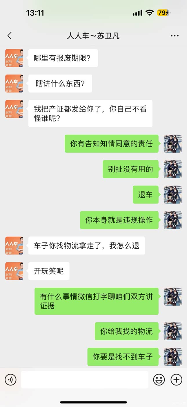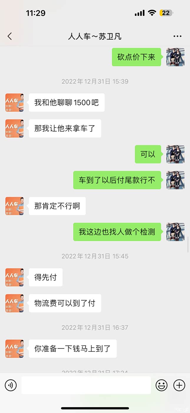 首先建议大家黑猫投诉搜索人人车,那上面说的全部是真实情况。人人车看的起亚车,联系销售说服务费可以打折,约车主看车,检测,检测没有任何车况报告,只是拍视频说车哪里喷漆,发动机和车主框架没动,试车也没问题,但没有深度检测报告,这时销售就催促马上交全部车款,在没有签任何合同,而且要打到销售个人户,车况没有任何说明,说app说的车况你都了解,车就这样,然后app上车已经下架了,无法再查看了。当时打了1万车款,我要求仔细看看再说,销售说只能有半小时仔细看的时间,没发,只能打全款,现在一看车过户3次,app上是1次,app上保障15天可退车,1年2万的保修,也因为服务费砍价没有了。车第一手户是网约车公司,是营转非车辆,销售在买车之前没有尽到车辆售前告知义务。销售不按照人人车的流程操作,我签的合同是和原车主签的,人人车没有签,相当于找销售买的车没有保障。