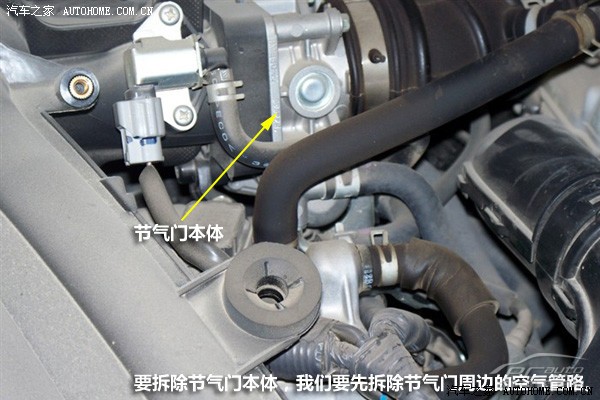 拆除了发动机罩盖,一般情况下我们便能够看到节气门了。节气门四周连接着一些空气管路,我们需拆除这些管路,并记清楚各管路的位置。