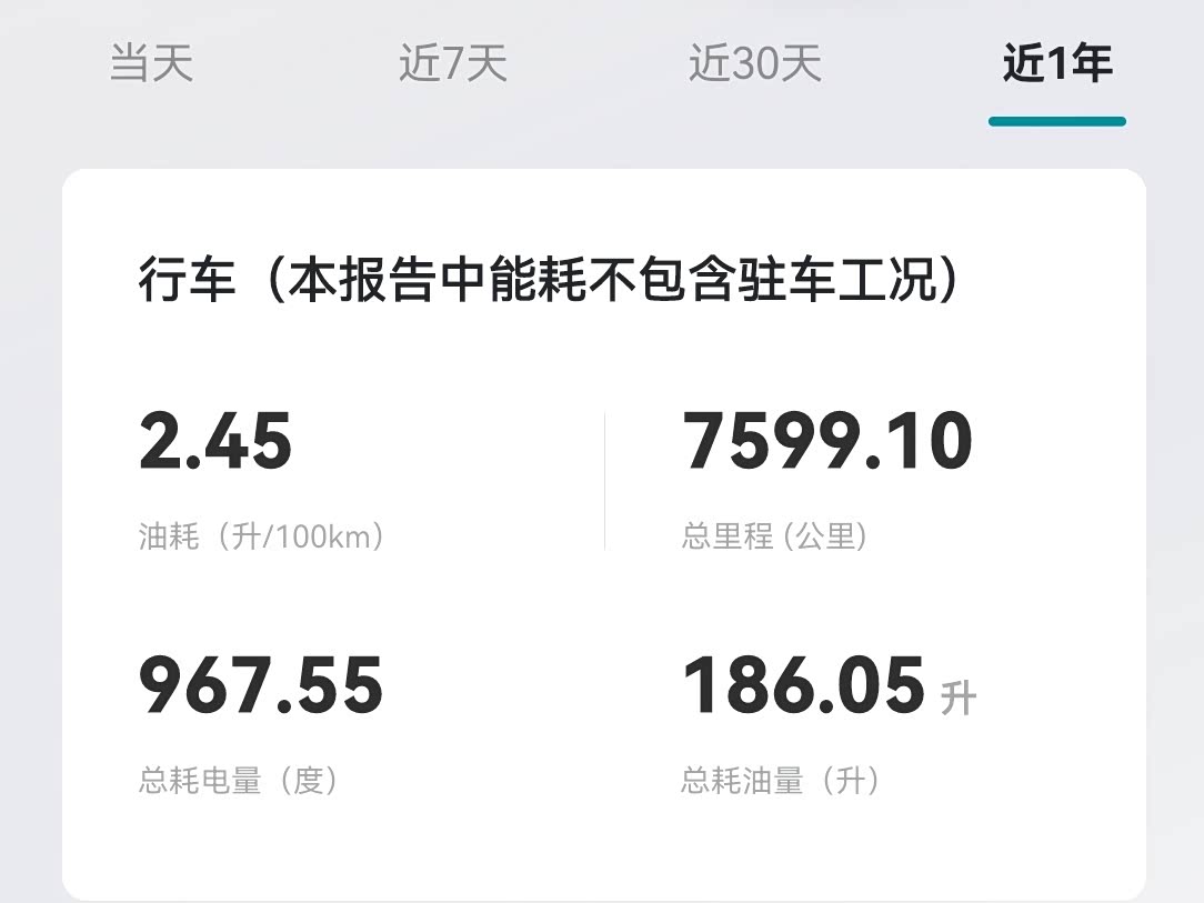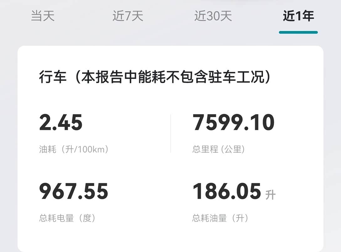 最近一年用车总里程7599公里 总油耗186(升), 总电耗量:967(度)