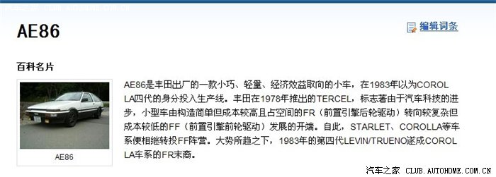 丰田AE86 AE86是丰田出厂的一款小巧、轻量、经济效益取向的小车,在1983年以为COROLLA四代的身分投入生产线。丰田在1978年推出的