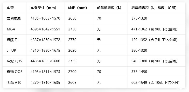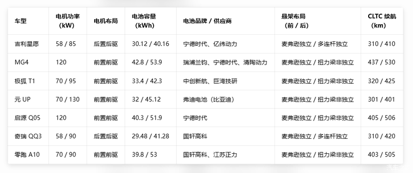 再看动力、悬架和电池。零跑A10低配70kW、高配90kW,基本上就是跟星愿、QQ3这些小型车坐小孩桌的动力水平(这桌也有块头比较大的小盆友--极狐T1),没落后但也没优势,和主流紧凑型车以及小型SUV相比还存在差距。全系前置单电机,前麦弗逊+后扭力梁悬架(这时候他又不跟进星愿和QQ3,而是选择了成本相对更低的板悬)。电池容量低配39.8kWh、高配53kWh,和MG4以及启源Q05差不多水平,终于和小型车拉开了差距。但电池供应商方面,国轩高科与江苏正力混用,显然又不如启源Q05的全系宁德时代来的有卖点。