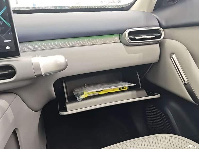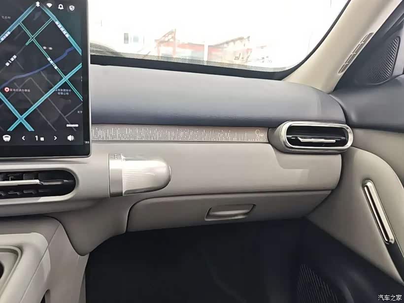在中控屏右下角有个小装置,官方称之为IP Bar,内置了香氛(难怪我说车里有股淡淡的香味),拿下以后还能作为应急安全锤使用,算是个不错的小创意。仔细观察我们还会发现,256色氛围灯在这台车上效果几乎看不见,我是中午12点的时候到店看的车,外面阳光普照,车内氛围灯我试着调了一下,无论是在什么颜色下,都几乎看不见,可能到了晚上会稍微好一点吧。