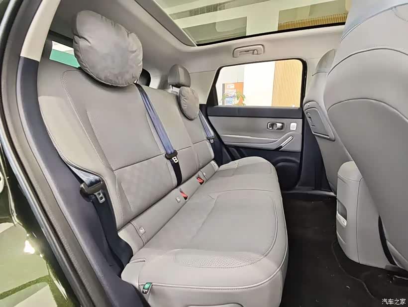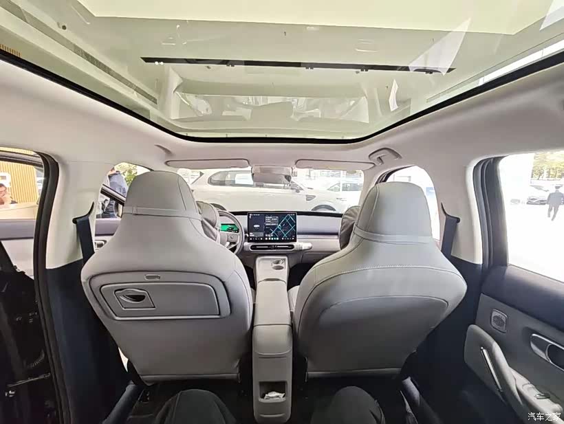 坐垫的填充也算饱满,皮子摸着也挺舒服,甚至后排中间稍硬一些的位置坐着也还行,尤其是头部空间很充裕。从后排看过去,1.55m大全景天幕还带电动遮阳帘,开扬感很足,不会显得车内很挤。