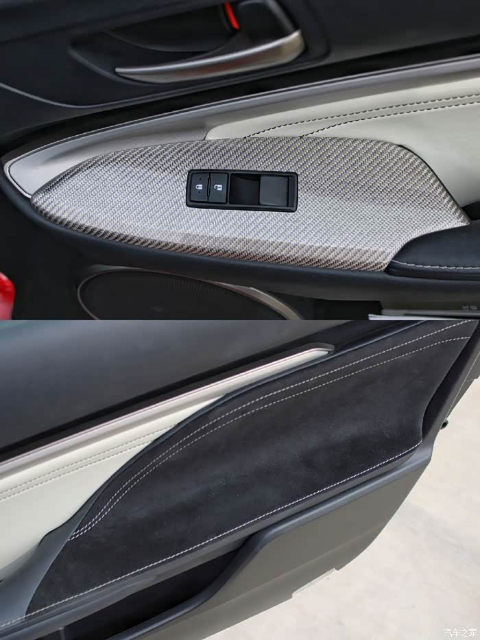 门板的用料十分高级,前半块采用了碳纤维的装饰,而后半块则采用了翻毛皮的材质,搭配起来视觉效果还是十分新颖抢眼的,所迷倒的地方触感也十分不错
