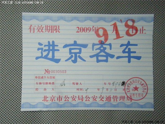 在六环领取的进京证,需要放在车前,有效期到二〇〇九年九月十八日
