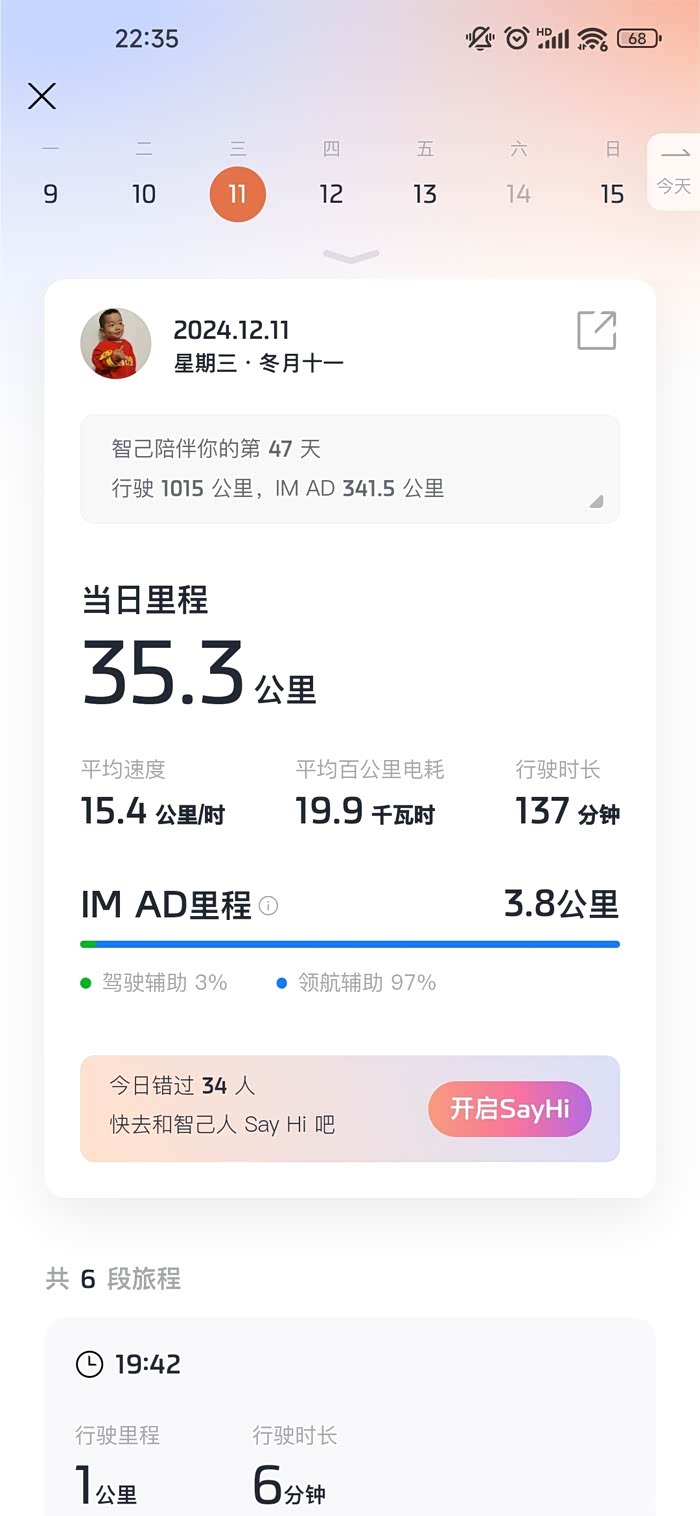 2.空调温度控制在23度,风量3档,搭配座椅和方向盘加热,在这温度下既保证舒适度又不会让电耗提升过多。