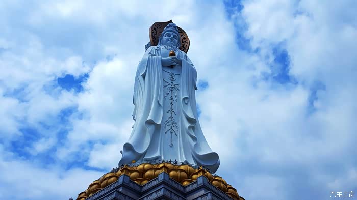 今天我们的行程是去南山公园看一看世界级的佛事工程。这个世界上最大的,高108米的观音圣像,被设计为正观音的一体化三尊造型,从每尊的正面看均是一尊观音圣像,分别持珠、吃莲、持箧,其衣袂飘飘似举、面相慈悲庄严,犹如踏海而来。