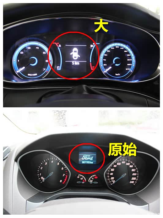 福克斯的仪表盘,造型挺好,但是行车电脑显示屏过于原始。