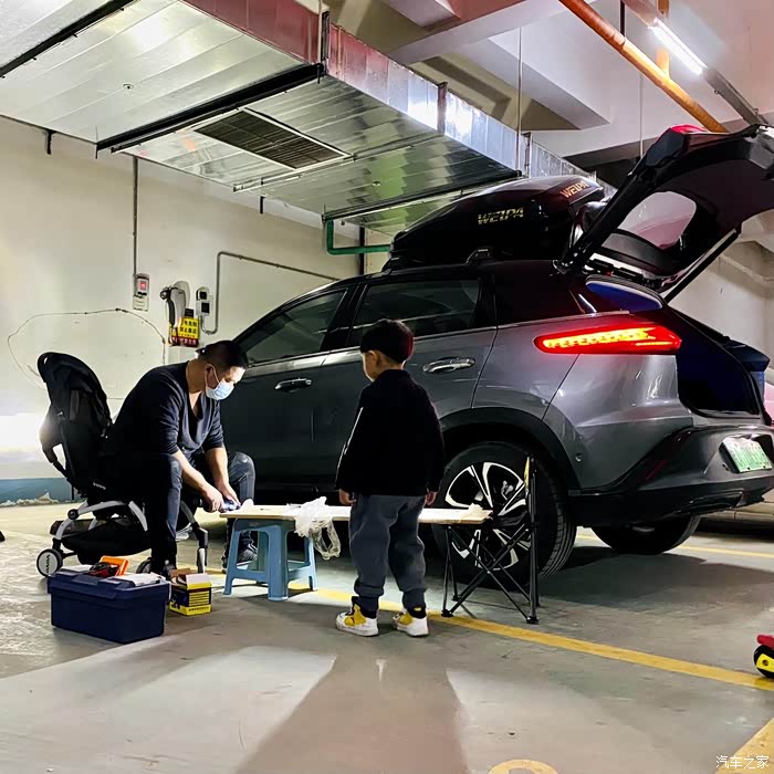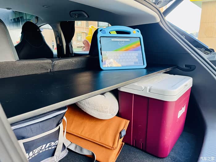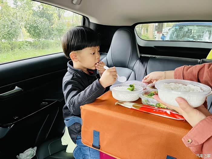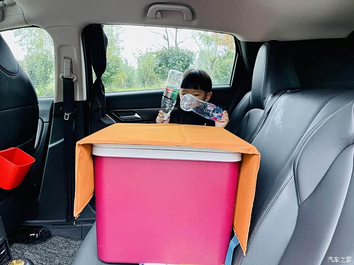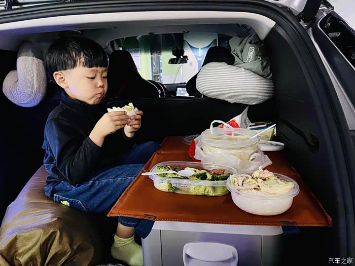 小孩么吃饭总是不老实,起除我是用置物箱零时搭建桌板,后来干脆让孩子坐在后备箱把冰箱当成桌子