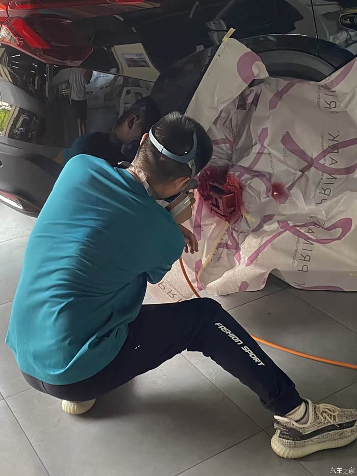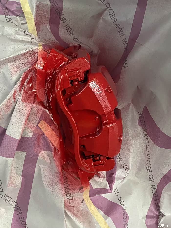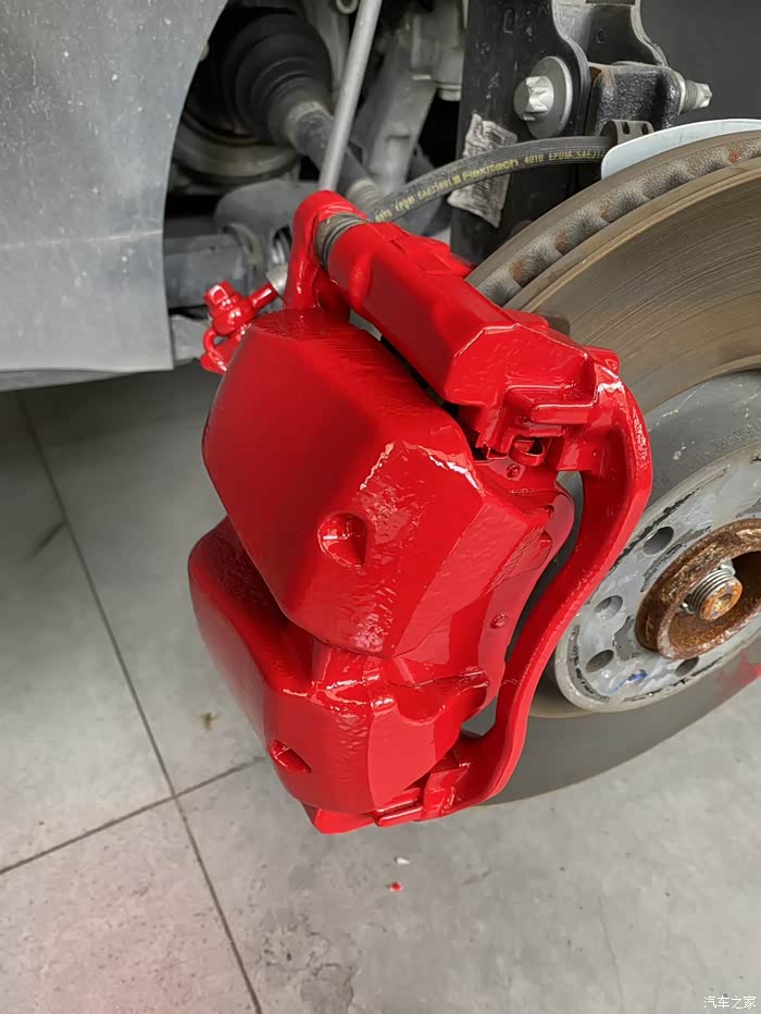 3. 卡钳改色:卡钳改色一般分为拆装喷漆和不拆装喷漆。拆装喷漆耗时更久,费用更高,难度更大哦,万一美容店师傅手艺不过关,对于汽车安全性也是个挑战。所以我选择的是更加便宜又方便的不拆装喷漆。轮毂拆掉,卡钳周围贴上报纸。对着卡钳一阵打磨,然后喷漆,用灯烘烤。最后装上轮毂就行。包工包料350元,不算贵吧。法拉利红的搭配我黑武士车身,绝了。