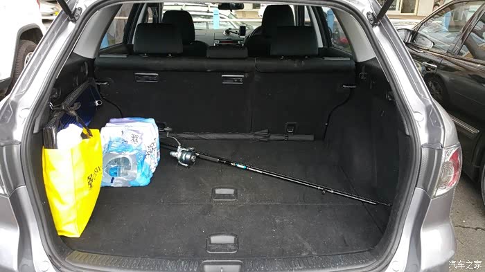 遮物帘被我取掉扔家里了,主要是有点挡住放高的东西了,而且那杆子很重。。。请忽略鱼竿和杂物,这后备箱简直是绝了,后座轻松放倒后就是张双人床