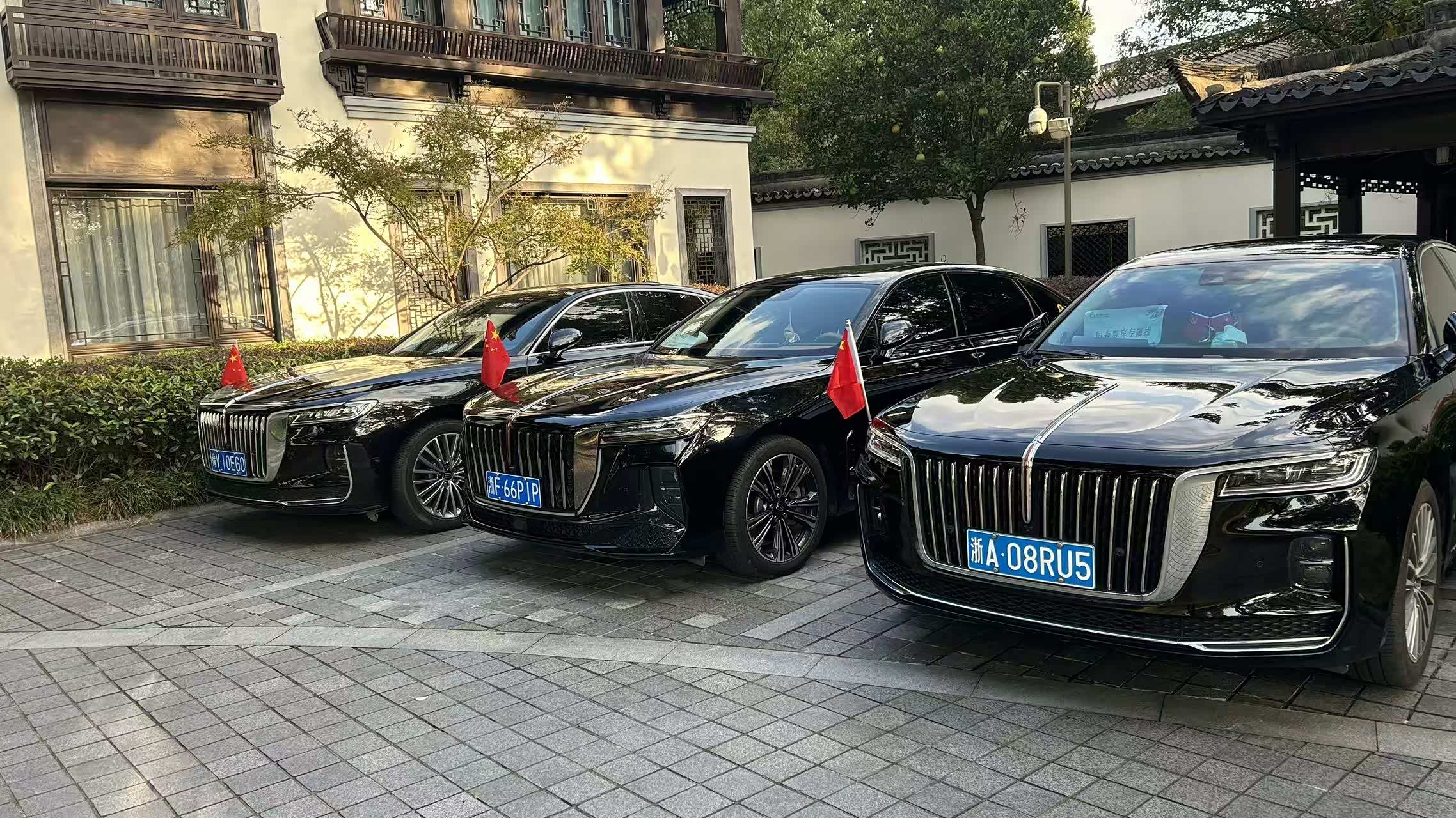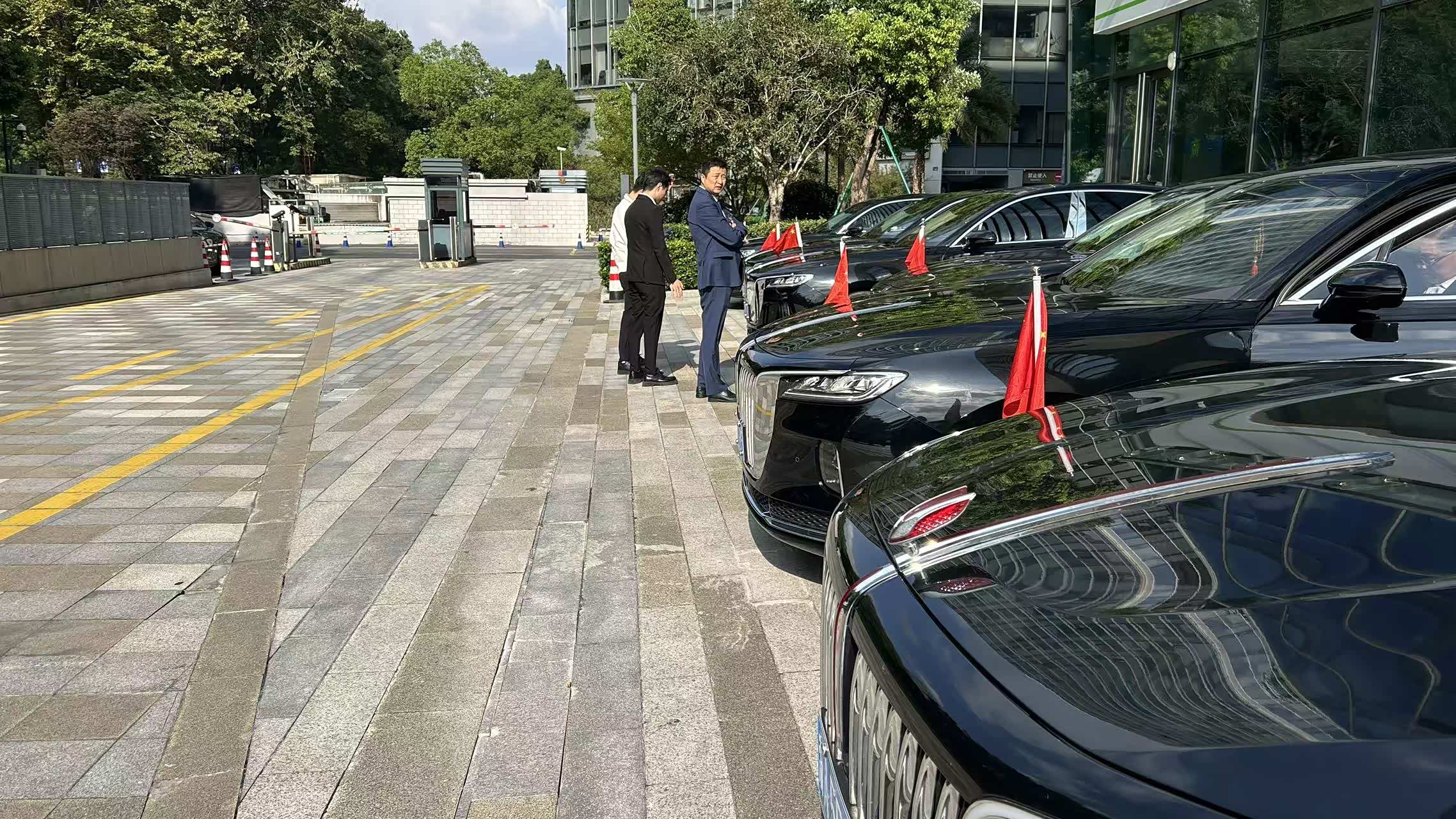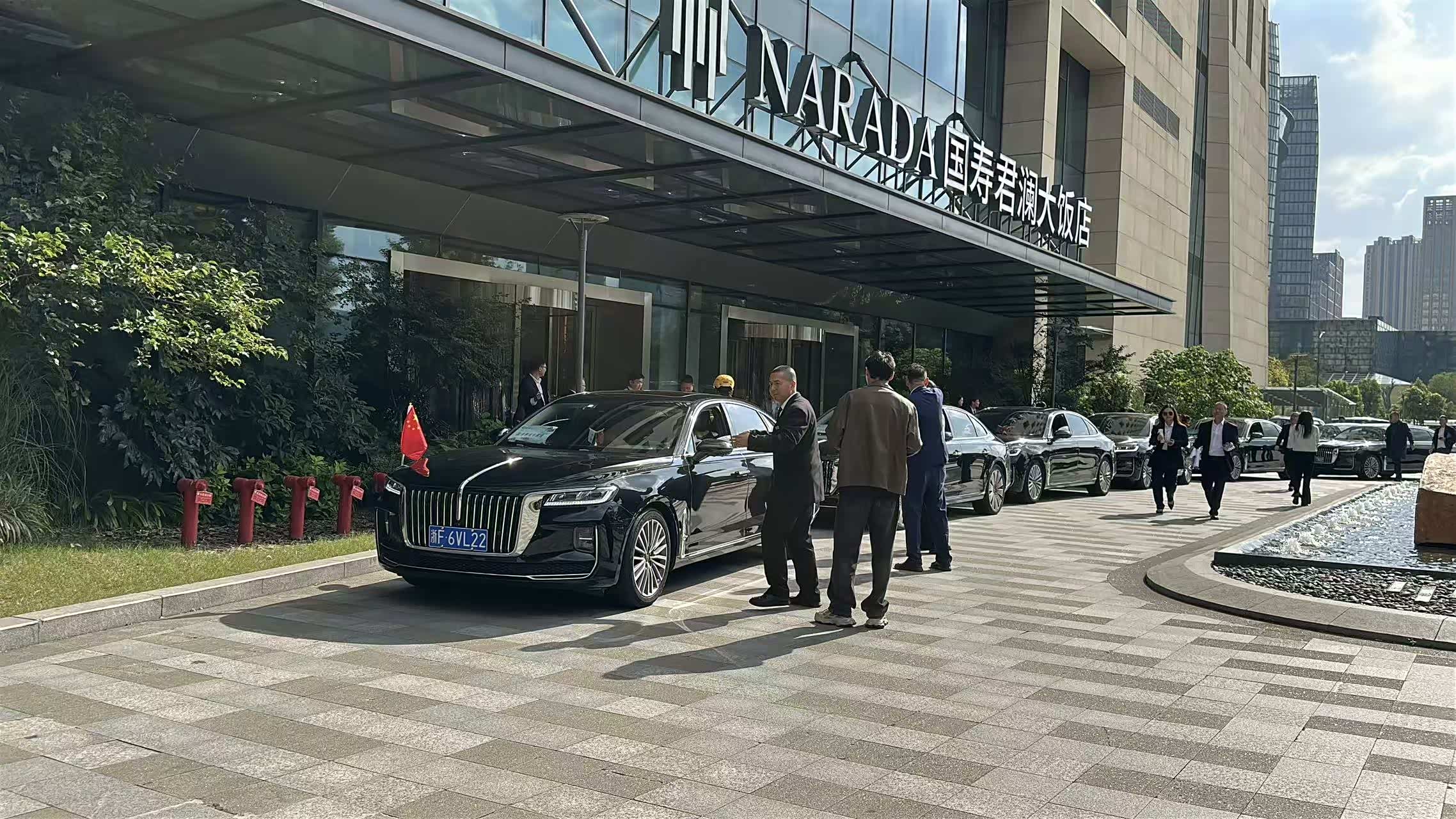 杭州国寿君澜大饭店前的广场上,77台红旗H9从各地陆续抵达。车友们默契配合,按照提前规划的站位依次列队,在秋日阳光下格外耀眼。签到环节中,工作人员为每位车友递上伴手礼与活动手册,无人机缓缓升空,从高空俯拍这支"赤色长龙",车友们站在爱车旁挥手合影,快门声与笑声交织,开启了活动的序幕。