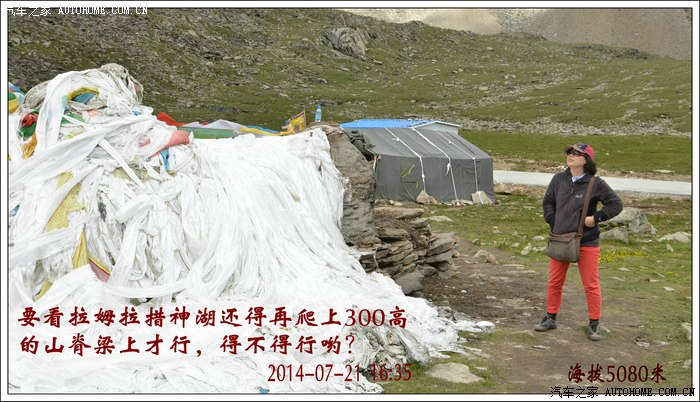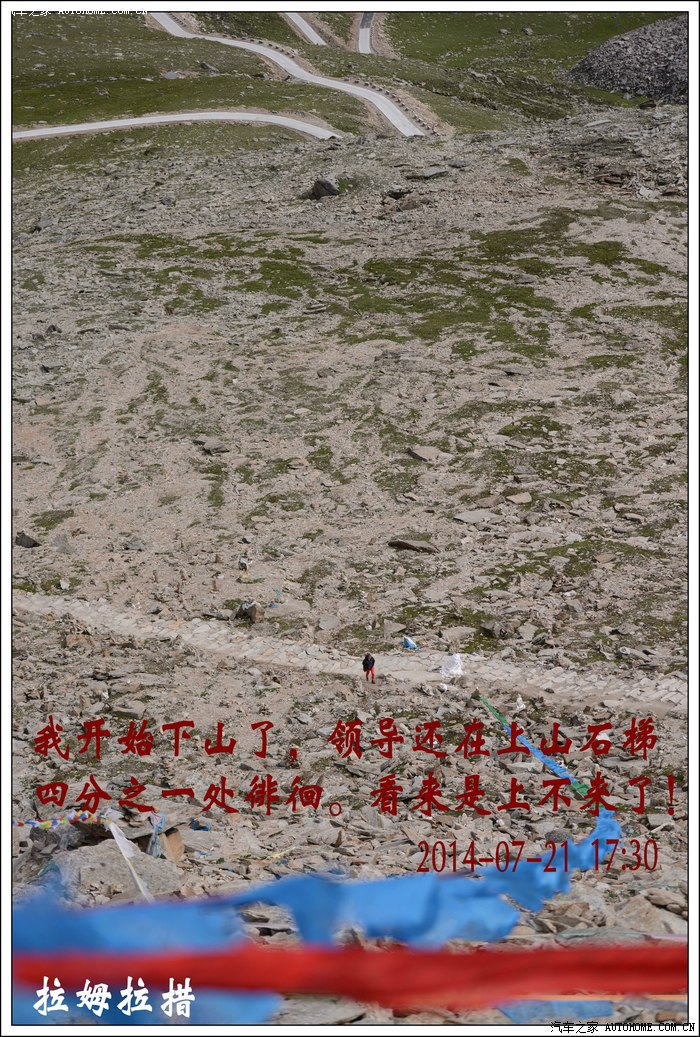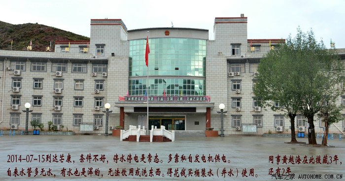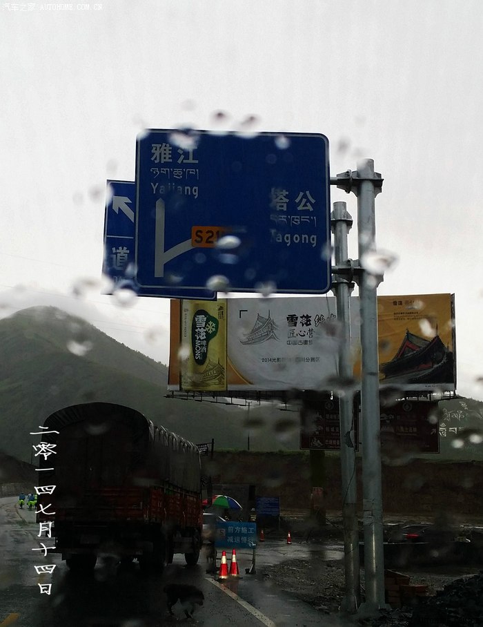 2014-07-31,,昨晚又是雨下个不停,她吃了2片安定才睡着。我是整夜都没怎么睡,翻来覆去,偶尔感觉有点儿气紧,这也是轻微的高原反应了。恍惚之间还做点“恶梦”,比如去看病、输液。熬到凌晨4点过,看看外面天没亮,在下雨。头昏眼花的,睡不着,使劲揉揉眼睛,盯着手机看,字和照片慢慢变得清晰了,大脑也开始逐渐清醒了,确认自己不会像我有个同事那样了,他去年到西藏玩了几天,感觉很难受,我们发现他回家后好长一段时间都有些反应迟钝了,还在医院去做了好几次的高压氧仓治疗。再看看她还比较平静,高反没有加重。6点钟起床,洗洗头舒服些,电吹风居然是坏的,还在自己带得有。到大堂去再次问问去珠峰大本营的事,被告知今天天气不好,去了也看不到什么。终于恢了心,不去看珠峰了,往回走去拉萨。走得早,办理限速条的警察还没上班,可以放心地走上一段。离开白坝镇不久就到了一段翻修的烂路,好些车在被大车压过的泥泞里艰难行驶,我把黑虎的底盘升高,另辟蹊径,大摇大摆过去了。到了日喀则,雨停了,简单午餐后赶往拉萨。途中见路旁有一个较深的的积水区,故意把车开进去来回往复几次,想把车底和侧踏板上的淤泥冲掉,后来估计就是在那儿把前面的车牌弄掉了。进入拉萨境内的一个检查站登记时才发现牌照不见了一块。据警察分析应该是掉在那个积水凼里了,他说积水区里常常可以看到不少车牌。顺带了一个警察去拉萨,把限速条上的时间提前了1小时,这下可以放心的走了,肯定不会超速的。17点到达拉萨,住宿布达拉宫附近。晚餐吃的四川的“老麻抄手”,爽!
