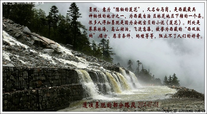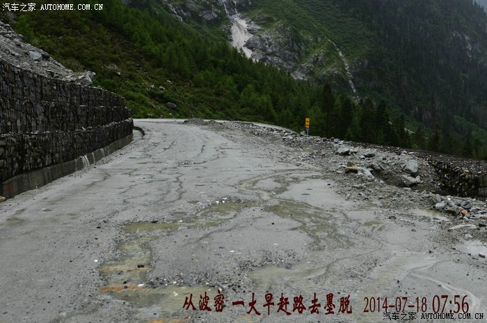 在波密县城去往墨脱一路上山,前28km也就是到52K检查站之前路都是水泥路和草油路,较好走,不过中间有一段约100多米的路着实有些吓人。这段路面有很多山上落下的飞石并且还有很大的流水直接冲上了路面。当时天还没有大亮,光线不太好,天又在下雨,孤孤单单一辆车在那儿,到底路面怎样,前面还有多少这种路也不晓得。吓得夫人直说不去了,说实话我也有些紧张了。定了定神,心想这条路不会这么夸张吧?才走了这么一点儿就退缩了?怎么也得再往前走走看!结果车子过这段路一点都没问题,除了有些石头外路面还好,积水也不太深