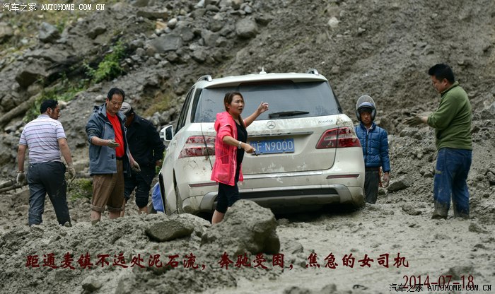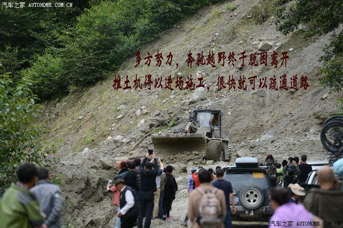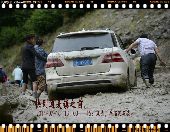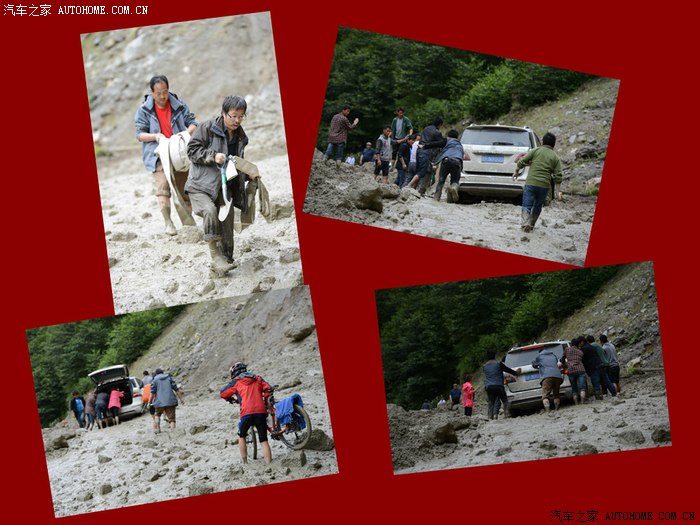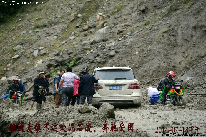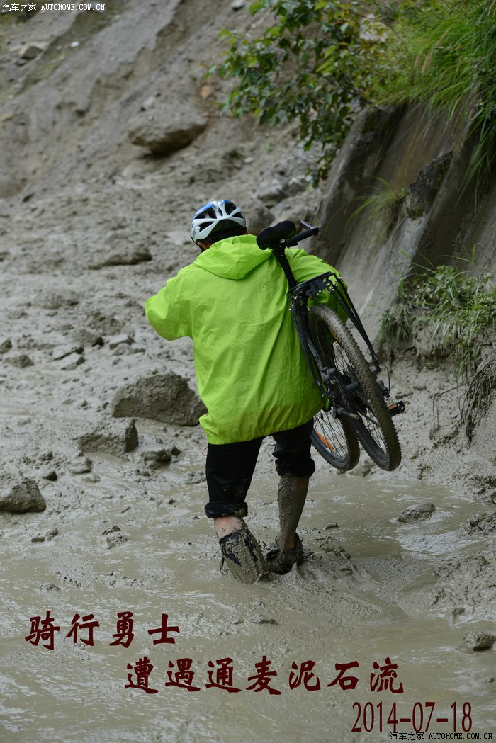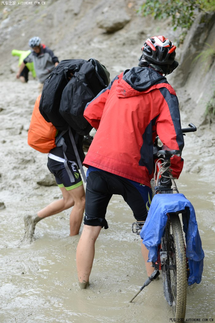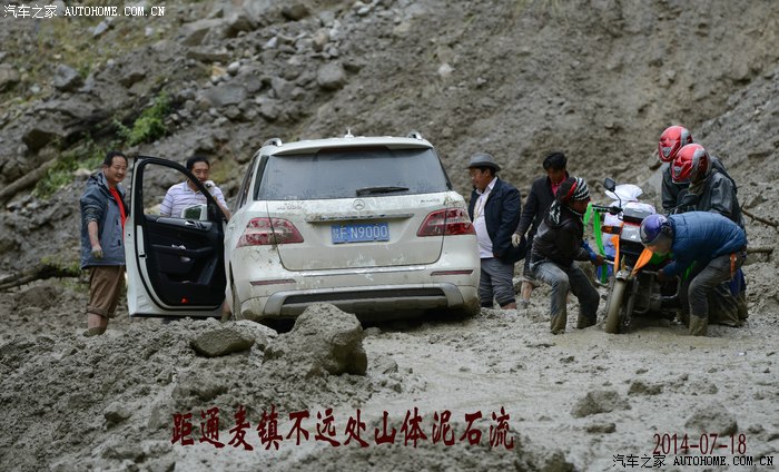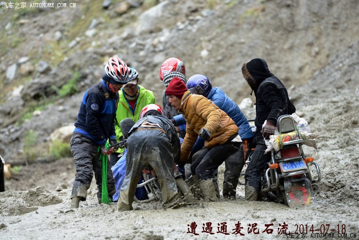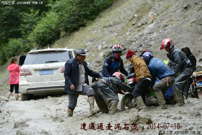波密去通麦的途中,快到通麦镇之前一处山体可能经常发生泥石流。虽然这次我们看到的仅仅是较小的缓慢的泥石流,要通过也是较为艰难的。这不,奔驰ML300越野车陷在里面走不了,不少人帮忙推拉毫无动静,警用越野车拉了好几次,拖绳甚至钢丝绳都拉断了,最后加上消防用的管袋才把奔驰拖出困境,而这花了1个多小时才搞定。结果是奔驰越野车前后保险杠和右前大灯都被损坏。而一些不愿等待的摩托车则是多人连拖带拉带抬才走出泥石流。骑行者也是分次肩扛行李和车子深一脚浅一脚地艰难趟过深达小腿的泥石流。