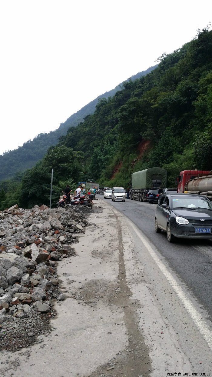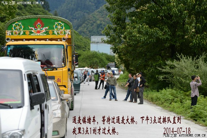 上午11点过到达距离康定25km出一路边餐馆午餐,餐馆不大,红烧排骨,味道很好,四川成都人开的。饭后走了一小段就遇上堵车,继续前行想一探究竟,得知堵车发生的源头是康定县一处名为瓦斯沟的地方,被堵的车起码上千辆。据说是前方一大货车撞上了山崖不能动弹,另外还有一处山上落下巨石砸扁了一轿车,庆幸的是好像无人受伤。这里也是去往达杠村的地方,达杠村的苹果很好在这地方很出名。去年去海螺沟路过此处时大家买了不少。不过千万别惹着那些卖苹果的妇女了,不讲道理,说些话可能气得你够呛,你再有理也跟她们说不清。