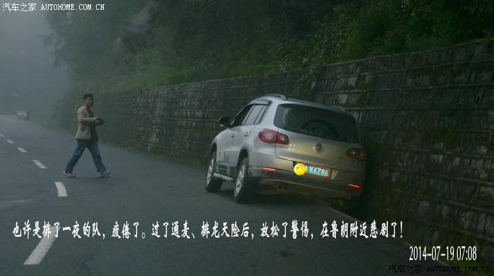 通麦天险过后,凌晨5点30分,在距离鲁朗风景区14km处感觉到了倦意,见前面有几台车打着双闪停在一处较宽的路旁,好像是在休息。我也紧挨着他们停了下来,闭眼稍微休息一下。在这荒郊野岭,的确不敢单车乱停。休息半小时继续上路,天色已亮,前行不足10分钟就看到一辆途观开进了路旁的排水沟,不能动弹,驾驶员拿手机在拍照可能是报了险。这兄弟多半是疲劳驾驶惹的祸。半夜三更才放行,究竟该怪谁?