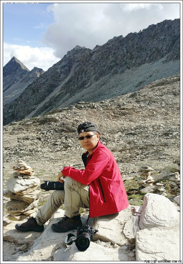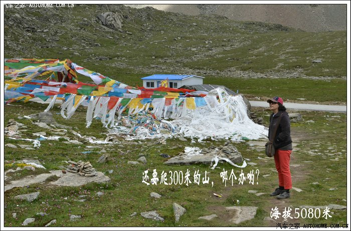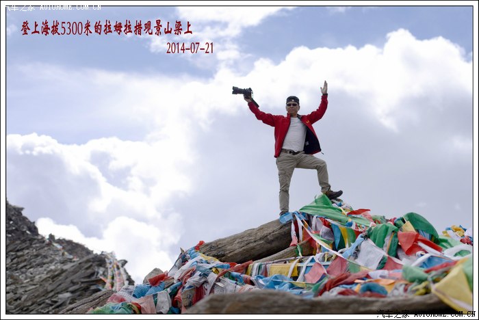 我独自拿起两部单反相机先行了,她在后面缓缓尾随。走了不久,感到又累又喘,站着都难受,必须坐着。休息一会继续爬山,大概每走几十步都得坐下来休息两三分钟等呼吸平稳后再走。大约35分钟我终于爬上了山梁。全程坐下来休息了11次,这已经算是不错的了,好几个二三十岁的人比我都不如。站在山梁上,到达之处满是经幡,梁上根本就没路,只有踩在经幡上艰难行走。经幡下面又是高低不平的石块,一不留神就会摔到。