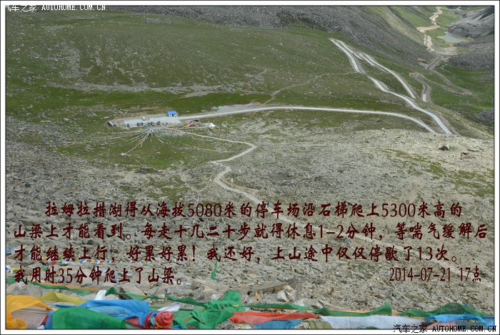 14点到达山南地区的加查县城。找了住宿地方后去了距县城50km的拉姆拉措景区。门票50元/人,身份证暂时要押在售票处,出景区时再领回。驱车进去,一路上山,不一会儿耳朵有些嗡嗡作响,海拔4000多米,之前5000多米的地方都没这种现象。道路很好,没多久就到了拉姆拉措停车场,海拔5000米,耳鸣消失了。停车场只有一位工作人员,车也只有几辆停在那,游客很少,不超过二十人吧。工作人员告知要看到拉姆拉措湖得沿石梯坎爬上300高的山梁上才行,因为湖在山的那一边。天哪!已经5000米的海拔了,还要爬300米的山!我倒是信心满满,可是夫人却犯起了嘀咕——啷个爬得上去哟?!