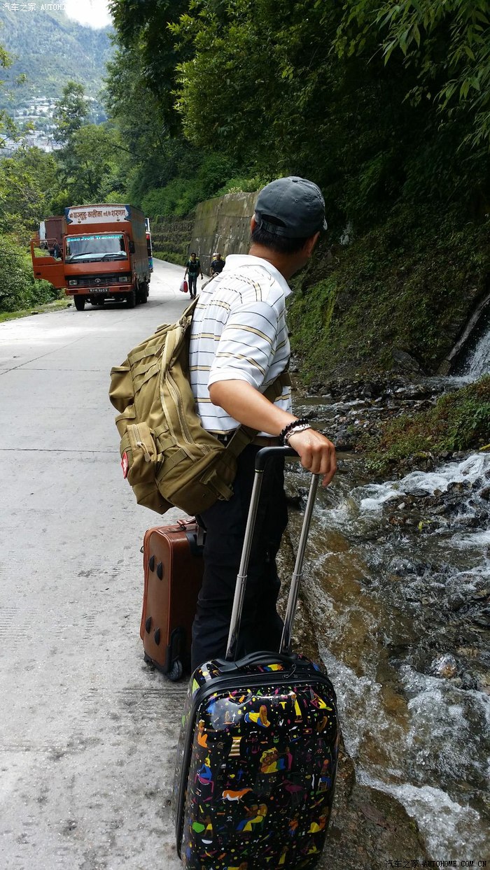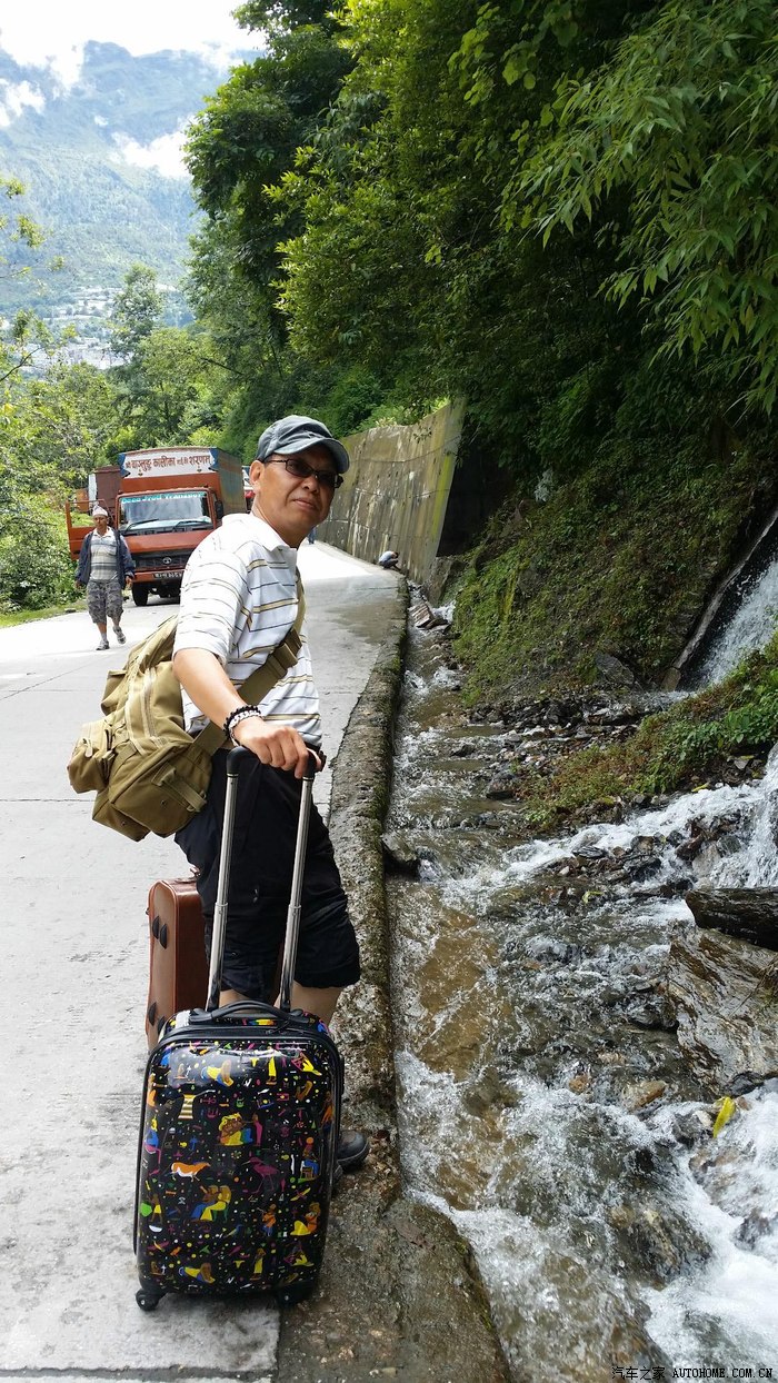 友谊桥上不许拍照,夫人拍了几张照片被中国这边强行删除。入境顺利,但樟木这边堵车严重,等了2小时都无动静,只好顶着太阳沿着狭窄的公路边走边等。一路偶尔可见车子通过,汗流浃背的足足走了2km才与人合伙搭上了一个出租车。出租车司机是一个年轻帅气的藏族人,很健谈,会说汉语、藏语、尼泊尔语和日常的简单英语,一路都很高兴,问他为何这样高兴,他说人生短暂为何要让自己不高兴呢?说得真好!
