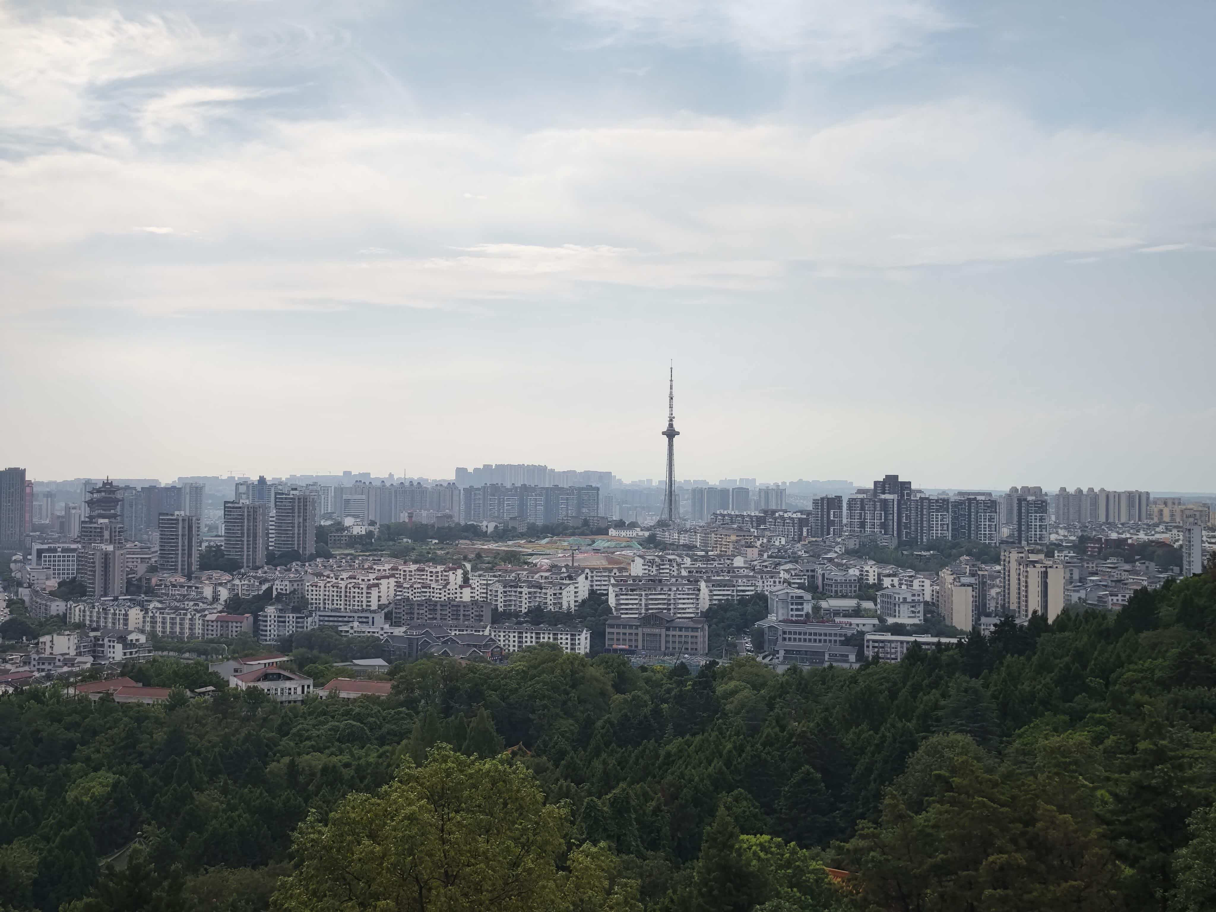大概爬了半个小时左右,我们就到了半山腰的观景台,站在观景台上往远处看,整个绵阳市区的全景尽收眼底,高楼大厦、河流桥梁,还有远处连绵的群山,构成了一幅绝美的城市画卷,当时正好是上午十一点多,阳光正好,天空湛蓝。