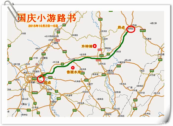 早餐后与驼兄一行依依惜别,互至珍重,经S2成巴高速返程,途径南部县短游升钟湖,一路顺畅,入夜返程中,遭遇多车追尾事故,万幸人车毫发无损,整个行程八百多公里。终于安全回家!