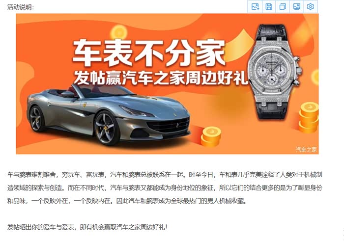 活动名称:【车表不分家】晒出你的爱车与腕表,赢取汽车之家周边好礼 我要报名