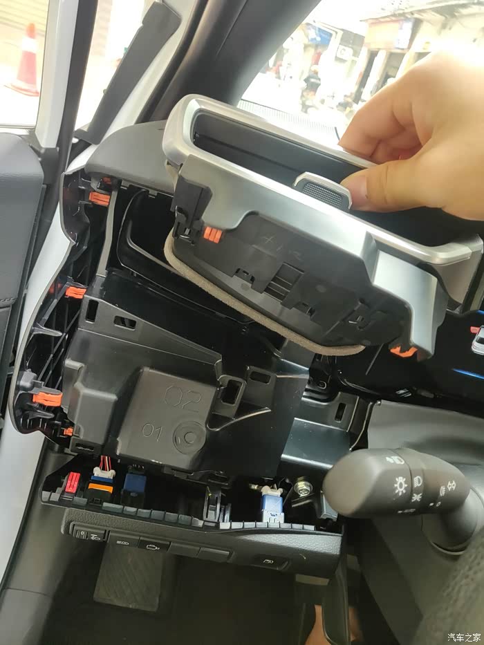 接下来这个,也是扣件,轻轻向外面拉一下就出来了,注意: 拆这个要先把下面的灯光调节面板拆下来一点,才可以拿出来。
