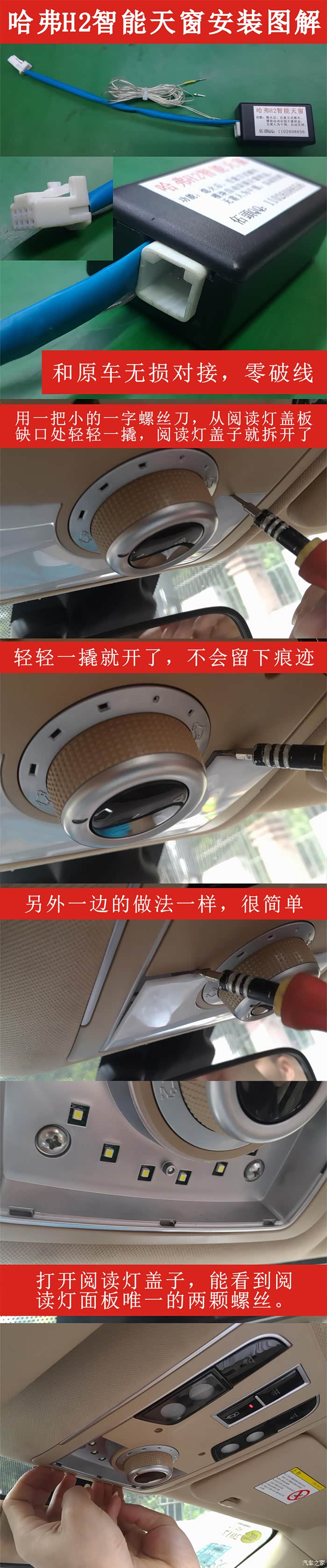 拆开仔细研究天窗工作原理之后,终于知道淘宝为什么没有成品出售了。用一句话总结,“H2的天窗太特么变态了。”天窗电机由独立的控制器控制,阅读灯天窗控制旋钮,给控制传输电阻信号控制控制器,控制器再控制天窗电机的运转。更为奇葩的是,控制器需要ACC做触发,而阅读灯没有ACC线。更可恶的是,天窗控制器拆不掉。或许这就是淘宝没有生产的原因。(H6的满淘宝到处都是)
