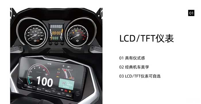 在更多的配置方面,力刻318拥有全车LED灯光配置、LCD/TFT仪表两个版本可选、PKE智能钥匙、前置高清摄像头、内置充电接口、双段式喇叭、前后碟刹+双通道ABS制动辅助系统等。油箱容量达到13L,结合官方给出的不高于3.0L/百公里的综合油耗数据,满油续航约400公里。