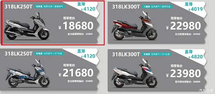 由于一次性降价的车型较多,我们就直接用组图的方式给各位车友进行展示。其中力刻318车系中包含250cc与300cc等级的四款车型,降价幅度最高的318LK250T原价22800元,现仅售价18680元,降幅达18%。