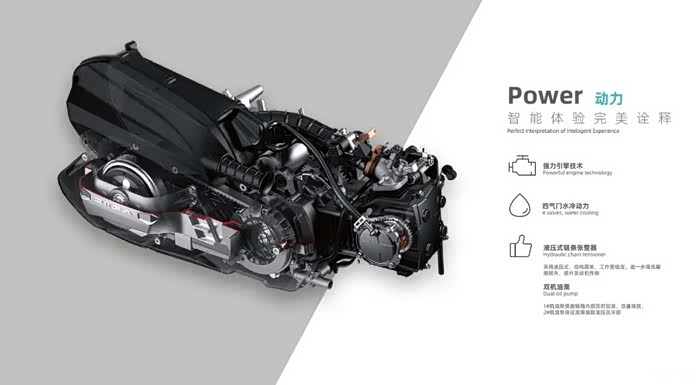 发动机使用另一款117.3cc单缸强制风冷发动机,最大输出功率为6.2kW/7500rpm,而最大功率则为9.3N·m/6000rpm。与同级车型类比,得益于使用了更大的缸径与更短的行程,所以及美108发动机的油门动态会显得更加活跃。