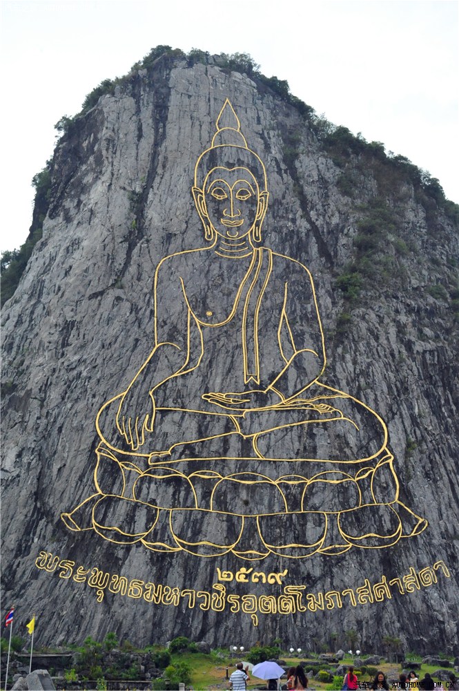 七珍金佛山位于泰国芭提雅,是泰国华侨为了庆祝泰皇登基50周年纪念送给泰皇的。那时东南亚排华现象非常严重,泰国华侨怕被这股潮流波及到,出于安定的考虑,传说由一个高僧为当今九世皇找的龙脉所在,就着山形剖开一面山,削平山面,依山用高科技镭射画出打坐佛像,用4吨(一说为18吨)意大利进口的24K黄金镶嵌线条,还在佛的心脏处藏有释迦牟尼的舍利和七颗价值连城的各色宝石,意寓:这座龙脉是非常珍贵的,金佛更珍贵,再加上无价之宝的宝石,都献给泰皇,表达广大华侨对泰皇的忠心。之后好像真有神灵保佑,排华现象在泰国并没有出现,而且从此以后泰国的经济真的有所好转。
