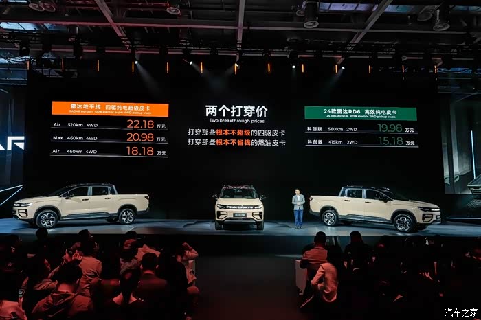 4月23日,以“超级皮卡 极限创无限”为主题的雷达地平线上市发布会在北京正式举办,新车定位四驱纯电超级皮卡,其中雷达地平线AIR 460km版售价18.18万元,MAX 460km版售价20.98万元,AIR 520km版售价22.18万元。雷达地平线的上市,为户外趣玩潮客群体带来全面升级的“带电”新体验。同时,高效纯电皮卡雷达RD6发布2024款车型,其中科创版415km、560km版分别售价15.18万元与19.98万元。2024款雷达RD6的焕新让纯电皮卡超越传统价值极限,开启皮卡市场“电比油低,电比油好”全新时代。