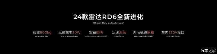 此外,24款雷达RD6也为用户带来了巨大惊喜,其载重能力由原来的450公斤增加到了800公斤,更加契合创客人群需要。驾乘舒适和便利性同时升级,车内新增了50w无线充电功能和220V接口,实现全车用电自由,并配置了定速巡航。外后视镜也增加了除霜功能,环境适应性大大提高。同时,用户呼声很高的货箱照明同样出现在了24款雷达RD6上。这些升级让24款雷达RD6成为创客的最佳搭档,创业之路更加“多快好省”