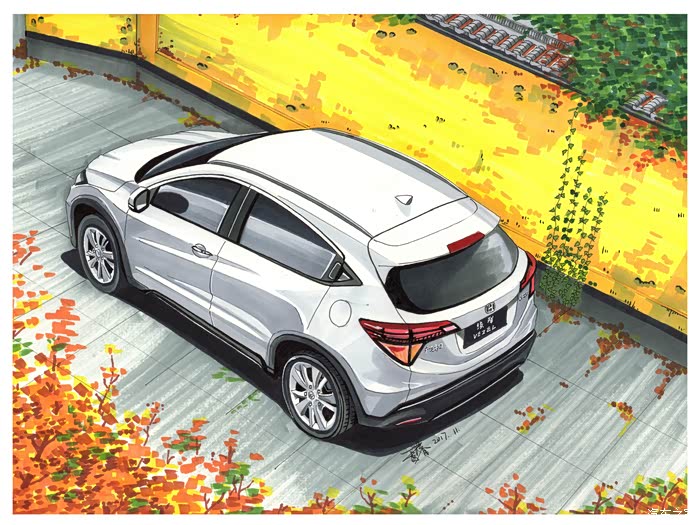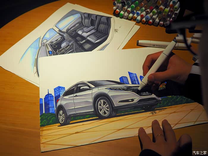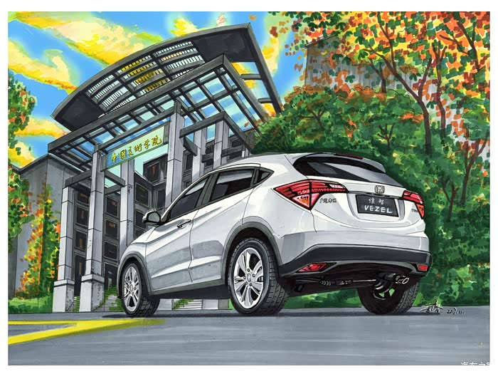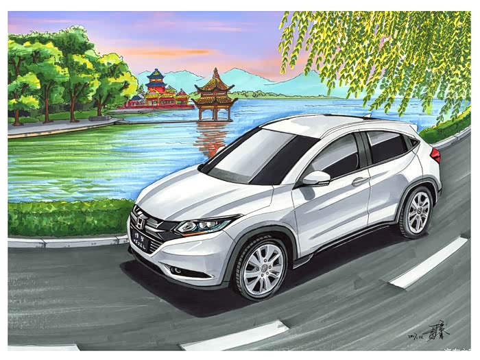 将汽车绘制在旅行中的各个目的地,从不同的角度来理解缤智的设计。