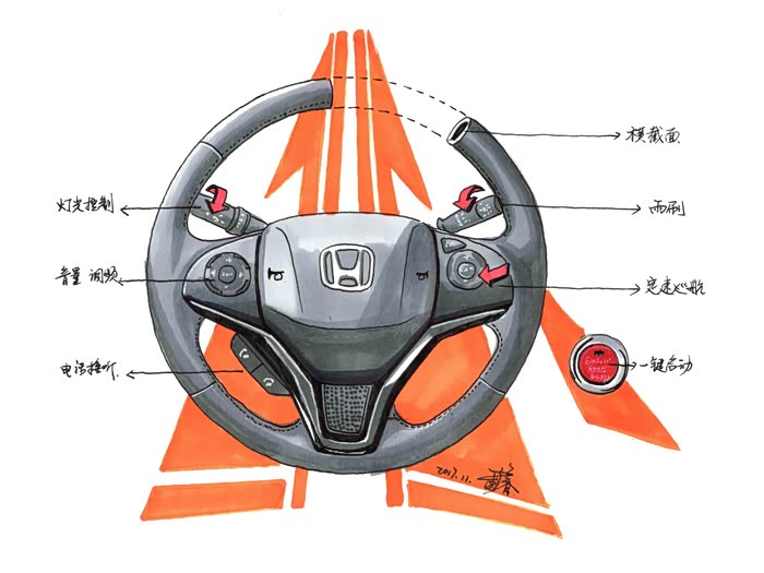【方向盘】:三幅式的真皮多功能方向盘手感很细腻,大小适中。我画的横截面能看出其实方向盘是是椭圆形的造型,很贴合手的掌控。