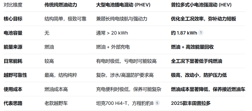 要理解普拉多的选择,首先需看清硬派越野车在电气化时代的三种主流技术方向及其核心矛盾。