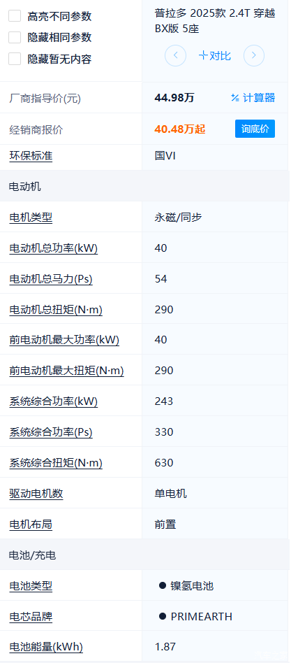 在硬派越野车全面拥抱电气化的浪潮中,2025款一汽丰田普拉多搭载的2.4T混动系统选择了一条独特的技术路径:它并未追求长纯电续航,而是仅配备了一块容量为 1.87kWh的小型镍氢电池。这一看似“保守”的决策,恰恰是丰田基于硬派越野车核心诉求——极致可靠性、全场景适应性与长效经济性——所做的一次精准而务实的工程平衡。本文将深入剖析这套“小电池”混动系统的内在逻辑,并对比传统燃油与大型插电混动,论证其在普拉多上的适配性与独特价值。