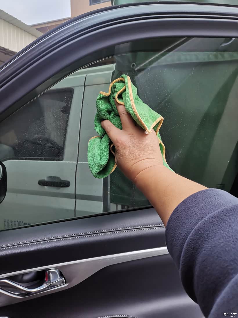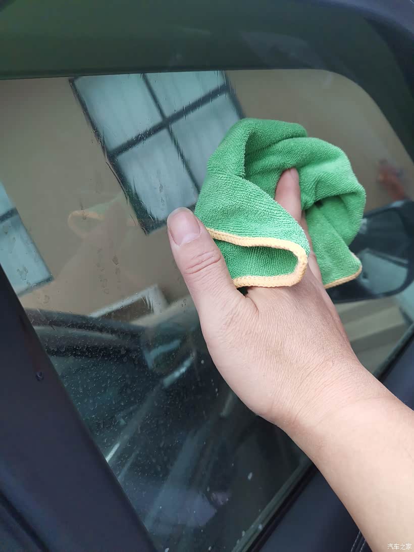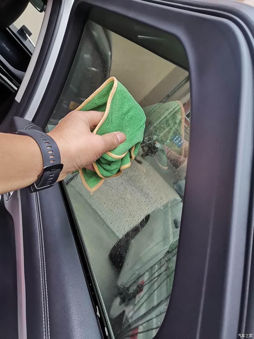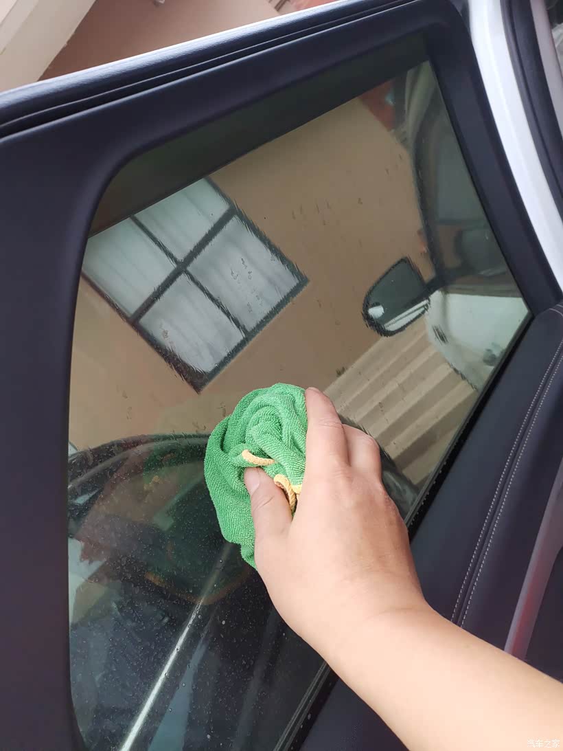 四个车窗+尾门玻璃都要擦一下,把污渍和多余的泡沫擦掉就行了,不需要擦得太干了,让玻璃保持一点湿润就行,这样冬季开车,车内也不会起雾了。