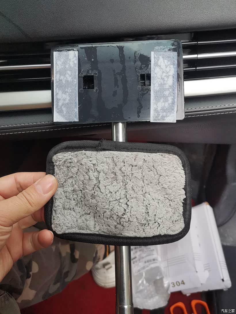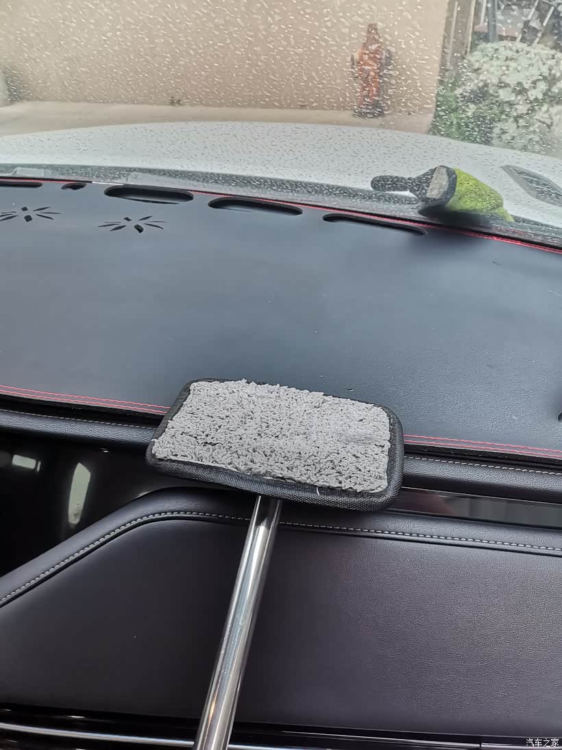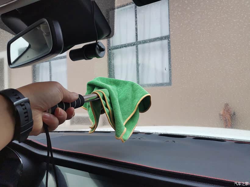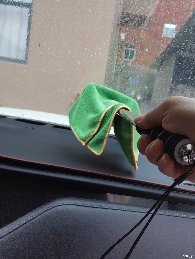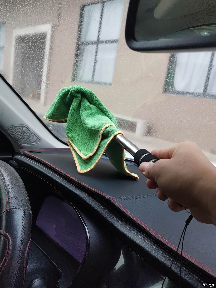 刷玻璃之情先把小毛巾上面的水轻轻挤一下,以免水太多会流在中控台上面,会留下痕迹影响美观。