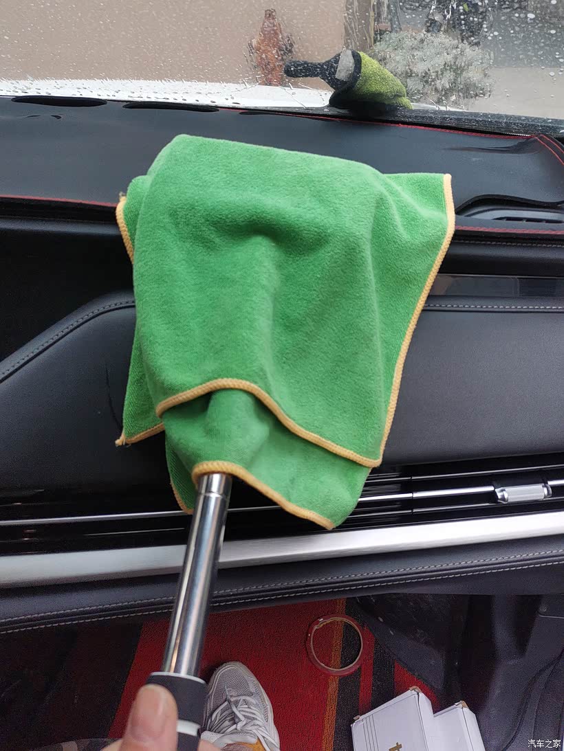 刷完一遍后就把这个小毛巾拆下来,换大毛巾去把玻璃上面的泡沫擦干净。