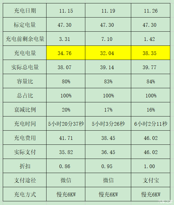 2020款比亚迪e2,官方续航403公里,三元锂电池47.3度,7.8万公里。由于续航现在只能跑200多点,也咨询了比亚迪的技师,也看了网上的视频,决定做几次满充满放。2024年11月15日(电量剩7%)和11月19日(电量剩15%)两次慢充都是到99%,是我人为主动结束了充电,11月26日(电量剩3%)慢充到100%结束充电,软件显示彻底停止充电,充进了38.35度。最后这1%要充的时间很长。等于前两次并没有真正充满。但愿续航能提升一些。