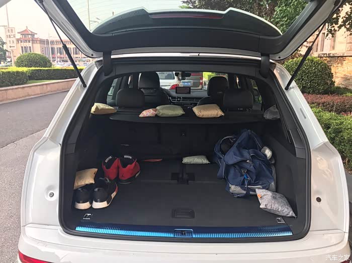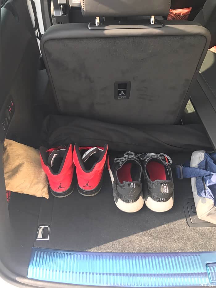 关心的第三排空间来了。本人183,体重83,第二排调至最前端,我膝盖与前边的距离一拳有余,第三排空间我坐进去短途没有压力,两个我坐进去正好,但是女士座肯定没有问题。头部空间我是比较费劲。三排竖起来,后备箱空间也无压力,比有些MPV的空间还大。后备箱在门全关的情况下可以降低后备箱,方便搬上搬下货物。请忽略杂乱!