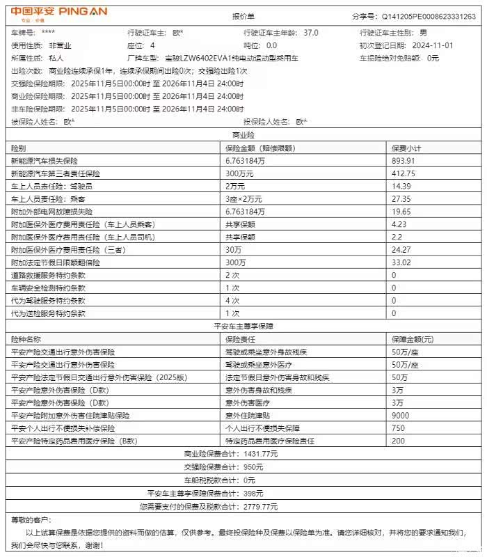 行驶1.5万多公里,部分是高速里程。用车成本的经济性是这一年最直观的感受。2025年一整年在家充电桩的电费大约1100元。市区实际电耗约12kWh/百公里,电价0.59元/度,每公里成本仅0.07元,相当便宜。五千多公里的时候去宝骏4S店保养,做了齿轮油更换和其他检查,第一次保养是免费的,没花钱。第二次保养里程刚刚到,还没时间去。用车成本最高的就是保险了。新车第一年保险3000块钱左右。十月份续购了平安车险,花费2700多块钱,包含了第三者300万、车损险、座位险等。新车不用上线车检,又省了一笔车检费用。用车轻轻松松。