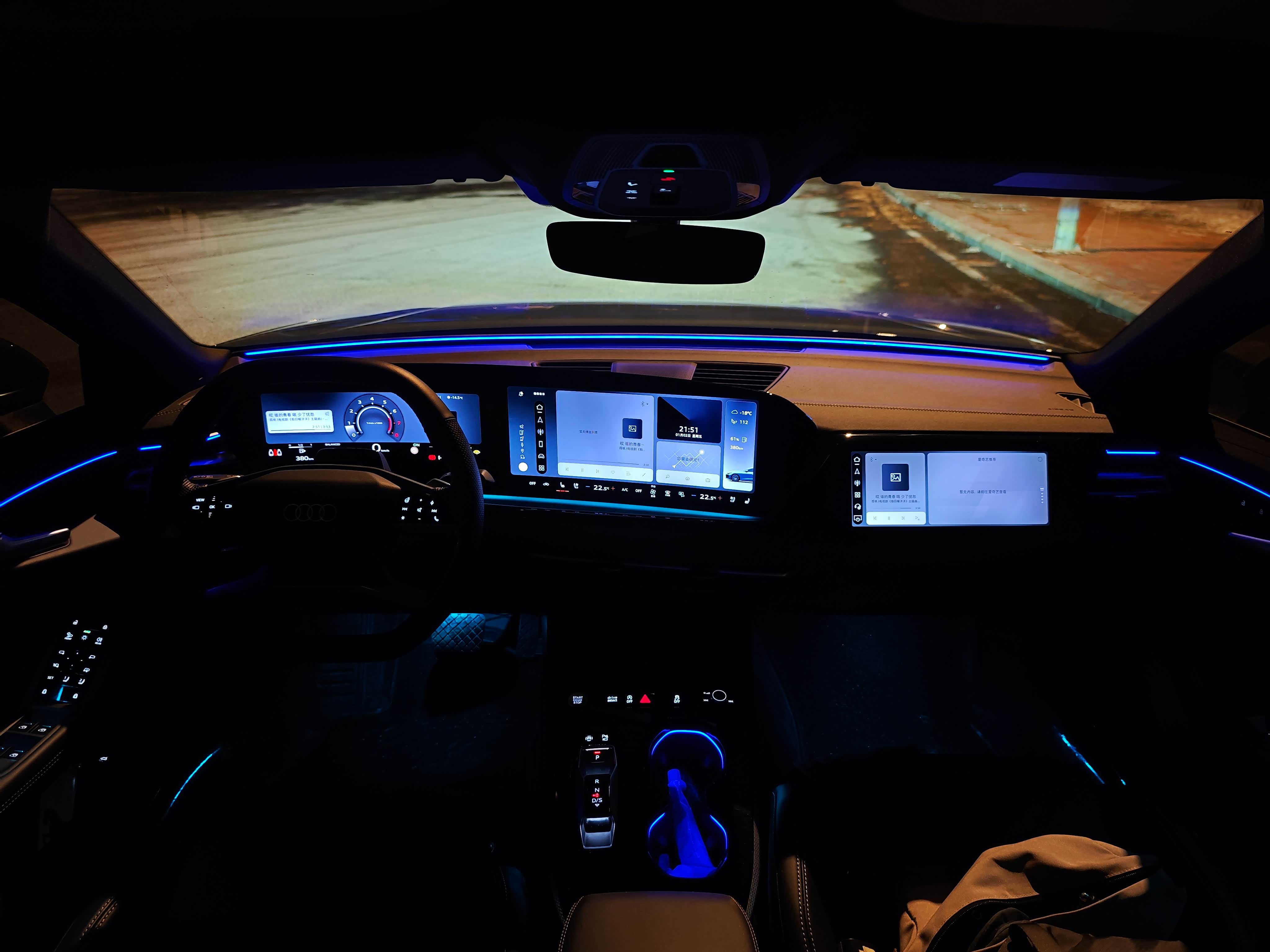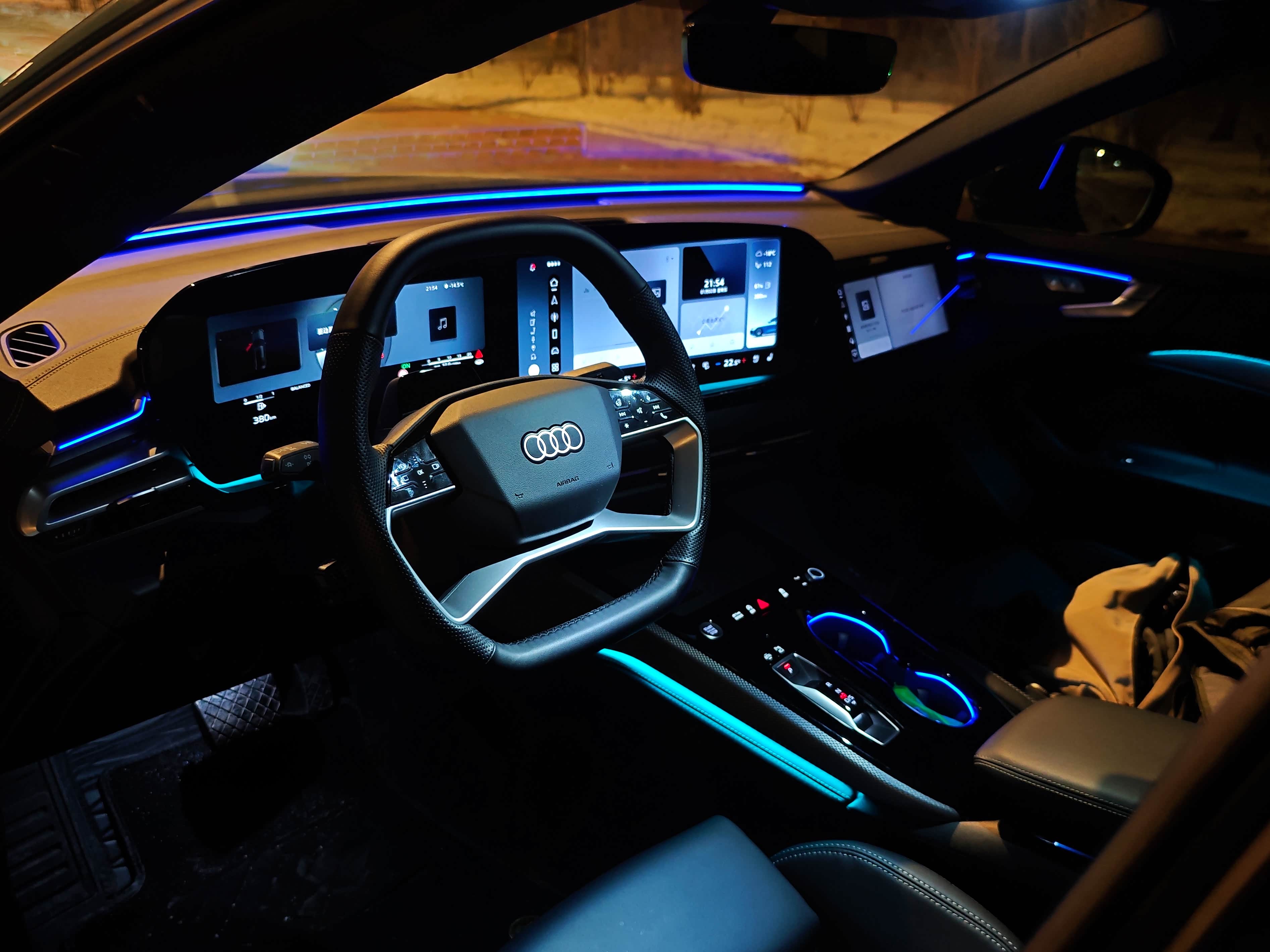 A5L Sportback内饰氛围灯个人感觉足以和奔驰C级相媲美,只不过它的氛围灯受内饰设计影响,大部分单条氛围灯的长度做得没像C级那么长,但夜间车内氛围感绝对不错。