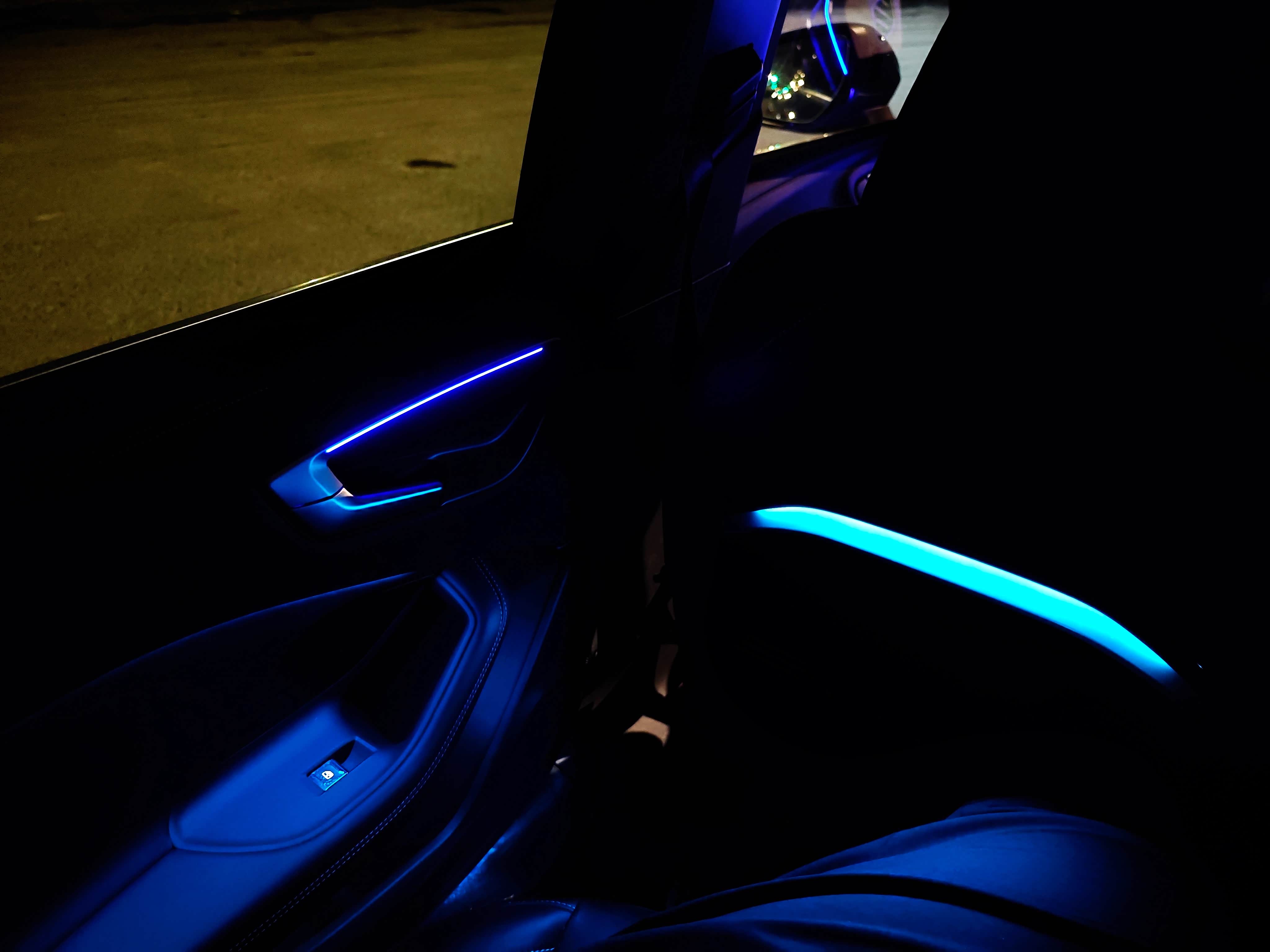 中控台最前沿,也就是前风挡最下方的位置,有一条贯穿中控台的氛围灯;中控台两侧出口上方各有一小条氛围灯;仪表盘和中控屏所在的一体式弧面屏下方有长条氛围灯;门板上的开门把手上面有氛围灯,下面有长条氛围灯;中控岛台两侧各有一长条氛围灯;换挡机构右侧的杯架外沿有一整圈氛围灯;两个前排座椅靠背后侧各有一条氛围灯。内饰氛围灯可以设置成上下不同色。